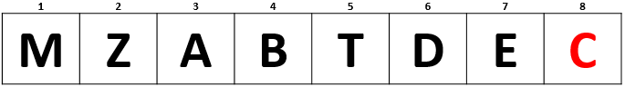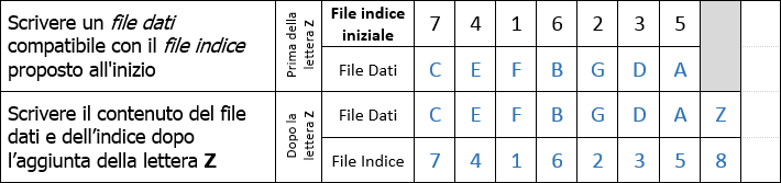 L'indice associato a questo file dati può essere ricostruito seguendo lo stesso procedimento visto precedentemente. In alternativa, sapendo che la C occupa la terza posizione nella sequenza ordinata, basta spostare il contenuto dell'indice originale di una posizione verso destra a partire dal terzo elemento. La terza posizione, che ora risulta liberata, dovrà essere riempita inserendo la posizione che occupa la lettera C ovvero 8.