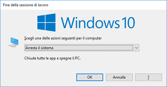 Alt-F4 => chiude l'applicazione attiva. Se non ho applicazioni attive in primo piano (ad esempio quando vado sul desktop con la combinazione di tasti "Bandierina+D") viene richiesta la chiusura di Windows