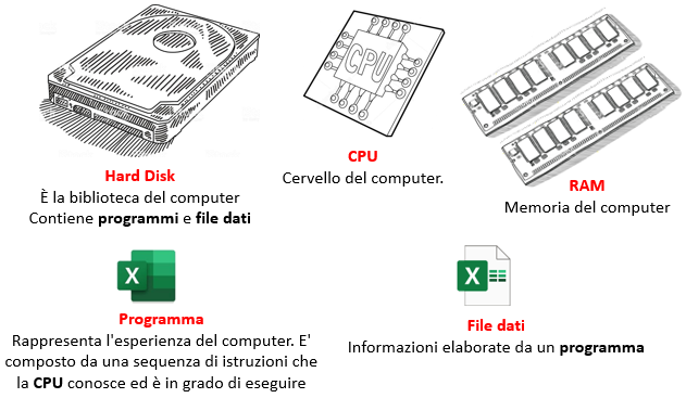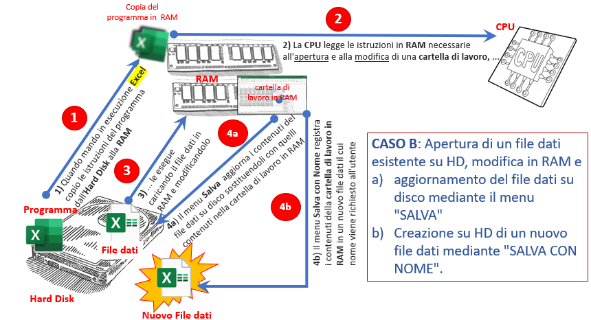 L'avvio di Excel consiste nel caricare in RAM il programma presente nell'hard disk. La CPU lo esegue e le modifiche ai contenuti della cartella di lavoro vengono temporaneamente registrate in memoria RAM. Con l'operazione "salva/salva con nome" le modifiche vengono archiviate in modo duraturo all'interno del hard disk.