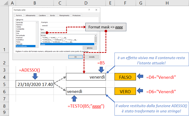 Maschera di formato => permette di visualizzare un dato in modo differente da come è stato effettivamente registrato all'interno di una cella. La maschera di formato non modifica il contenuto di una cella ma lo mostra solo in modo differente. Ad esempio una cella che contiene la data 24/09/2021, utilizzando la maschera di formato gggg, mostrerà solo il nome del giorno della settimana (ovvero "venerdì").