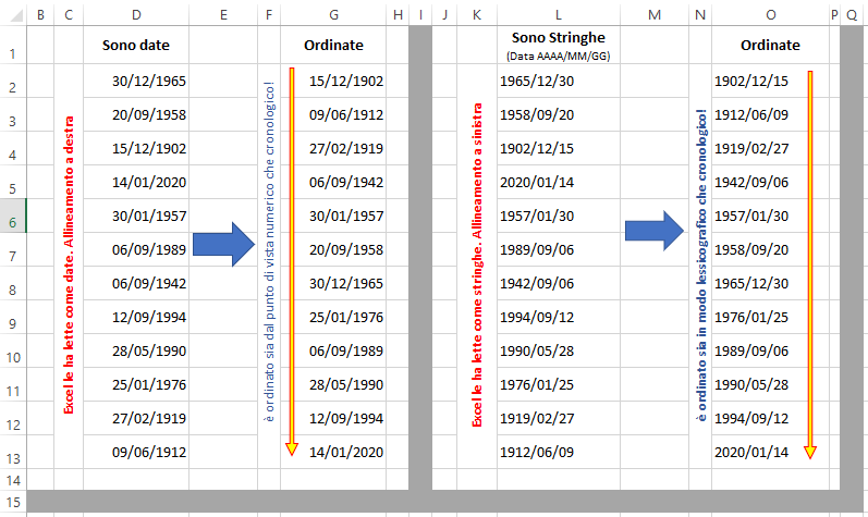 Si osservi l'allineamento a sinistra del dato 29/02/2015 (apparentemente cronologico!). Questo perché Excel ha capito che non si tratta di una data (il 2015 non è bisestile!) e pertanto la tratta come fosse una sequenza di simboli (in informatica tale sequenza prende il nome di stringa ovvero una sequenza di caratteri che usa la tabella ASCII come codifica!)
