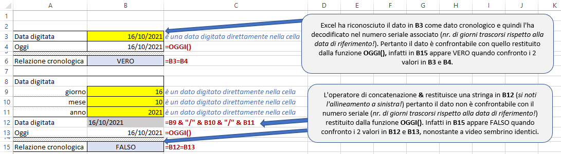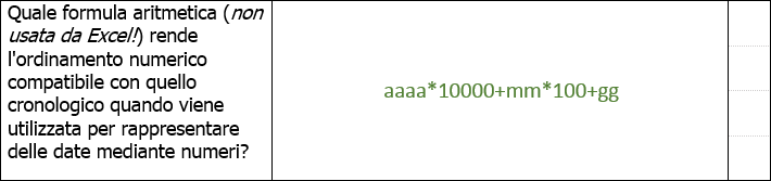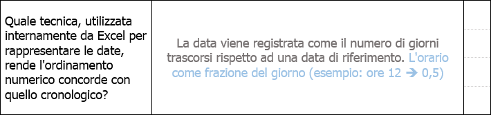 1) leggibilità: SI - Interpretare la codifica 43.788 come il 19/11/2018 non è certo una cosa semplice! Excel aggira questa scarsa leggibilità della codifica sfruttando le maschere di formato (ad esempio "gg/mm/aaaa") che trasformano quel numero in qualcosa di umanamente comprensibile. Pertanto possiamo considerare il primo obiettivo raggiunto.
