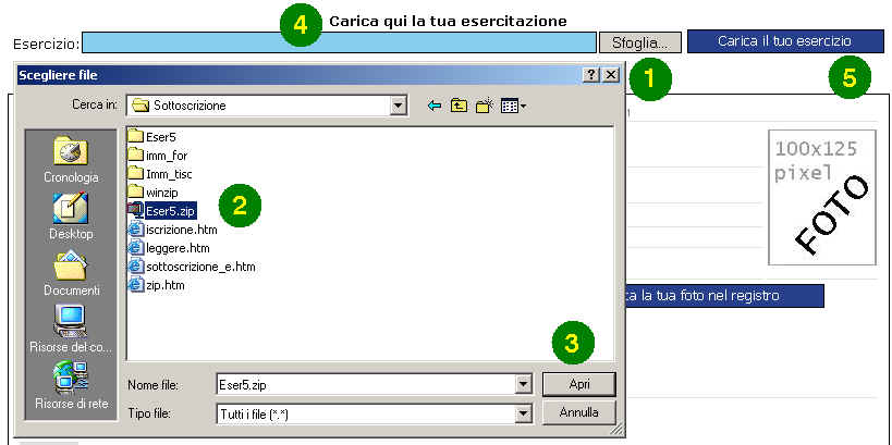 6) Cliccare sul pulsante Sfoglia (1), selezionare il file in questione (2) e confermare con il pulsante Apri (3). In corrispondenza della casella di testo azzurra (4) deve apparire il percorso del file che state caricando (Upload). Terminate l'operazione con il pulsante apposito (5)